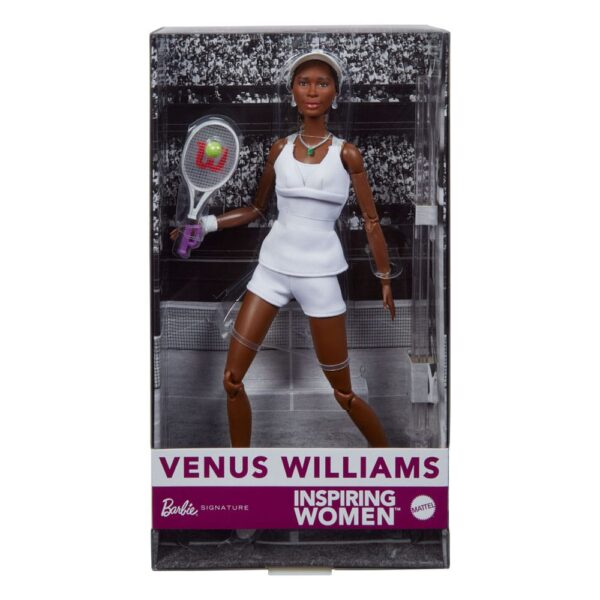 iThe Barbie® Inspiring Women™ series pays tribute to incredible heroines of their time; courageous women who took risks, changed rules and paved the way for generations of girls to dream bigger than ever before. Despite facing gender pay discrimination throughout her tennis career, Venus Williams was committed to achieving more success both on and off the court. She demanded equal prize money for the women's tennis tournament champion as for the men. Sculpted to her likeness and wearing her 2007 tournament tennis uniform, including a visor, tennis racket, & tennis ball, this collectible Barbie® doll honors the world champion tennis player & advocate. Includes doll stand and Certificate of Authenticity. Barbie® doll cannot stand alone. Colors and decorations may vary. Note: Packaging illustrations serve only as examples and may differ from the actual packaging in terms of design or language variant.