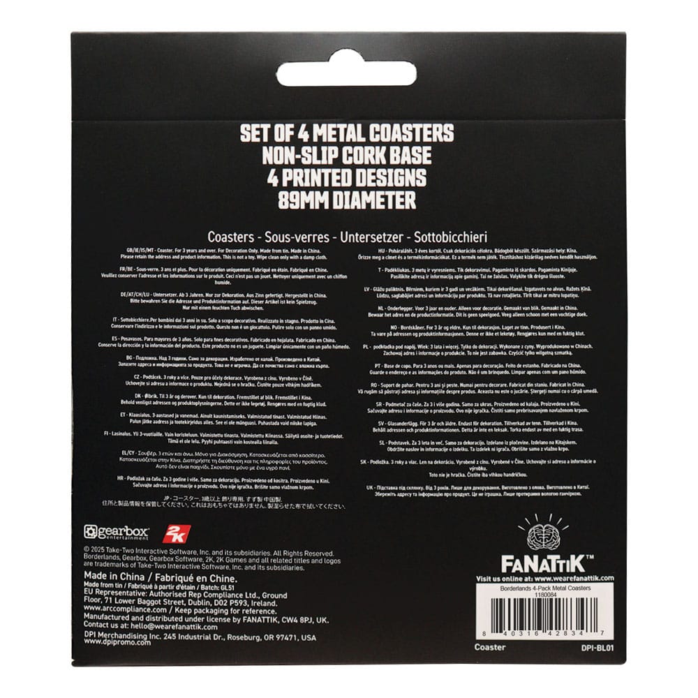 iEnjoy a taste of Pandora with every drink! The Borderlands 4-Pack Metal Coasters is an essential set of barware for Vault Hunters. On the bottom is an anti-slip cork base, and on top is a tin surface printed with artwork from the world of Borderlands. What drink do you think pairs best with each? - Officially licensed - Four designs - Metal top with cork base - Diameter 89mm "