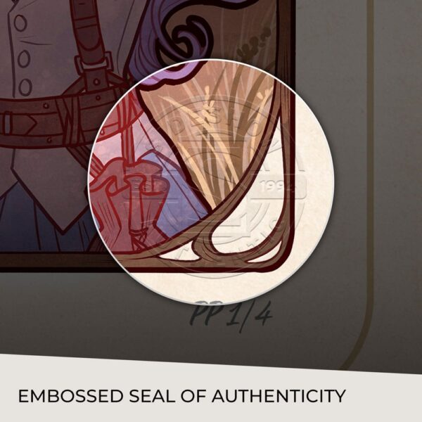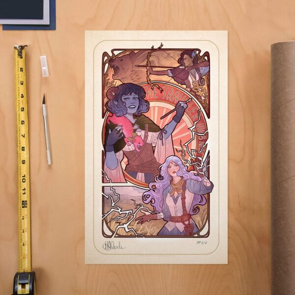 "The adventure begins; they were always beside you." Sideshow Art Prints presents the Critical Role 10th Anniversary: Laura Bailey Fine Art Print by artist Hannah Alexander, celebrating a decade of adventure across multiple campaigns. This parchment-styled, Art Nouveau-inspired illustration captures a trio of Laura Bailey's characters from Vox Machina, the Mighty Nein, and Bells Hells. Three characters, each varied in personality, abilities, and history, stand connected by one player and the threads of fate woven across Exandria. At the top of the print, nimble Vex'ahlia takes aim and proves why they call her Grand Mistress of the Grey Hunt. In the center, the bubbly blue mischief-maker Jester Lavorre leaves a little reminder that "the Traveler was here," for those looking to open their hearts to chaos. Below, prodigy spellcaster Imogen Temult seeks to understand the origins of her arcane abilities, framed by lightning from her fingertips. This intricate composition features incredible details from throughout Laura Bailey's time at the Critical Role table, giving fans a chance to relive the excitement and action of 10 years of storytelling. The Critical Role 10th Anniversary: Laura Bailey Fine Art Print is limited to a hand-numbered edition size of 310 pieces as a part of the officially licensed Critical Role collection by Sideshow. Each print features an authorized, automated signature of artist Hannah Alexander and an embossed Sideshow Seal of Authenticity. Available as an unframed giclée print or in a custom framed presentation, this Critical Role art print makes a memorable addition to any Critter's home. Collect your individual favorites or bring home the entire set of 8 anniversary art prints for the ultimate tribute to a decade of Exandria. Join the party and roll with the Critical Role 10th Anniversary: Laura Bailey Fine Art Print by Hannah Alexander today. Print details: - Officially licensed by Critical Role - 46 x 28 cm full bleed fine art giclée print - Heavyweight 100% cotton, acid-free, certified archival Fine Art Paper - Epson archival inks - Embossed seal of authenticity