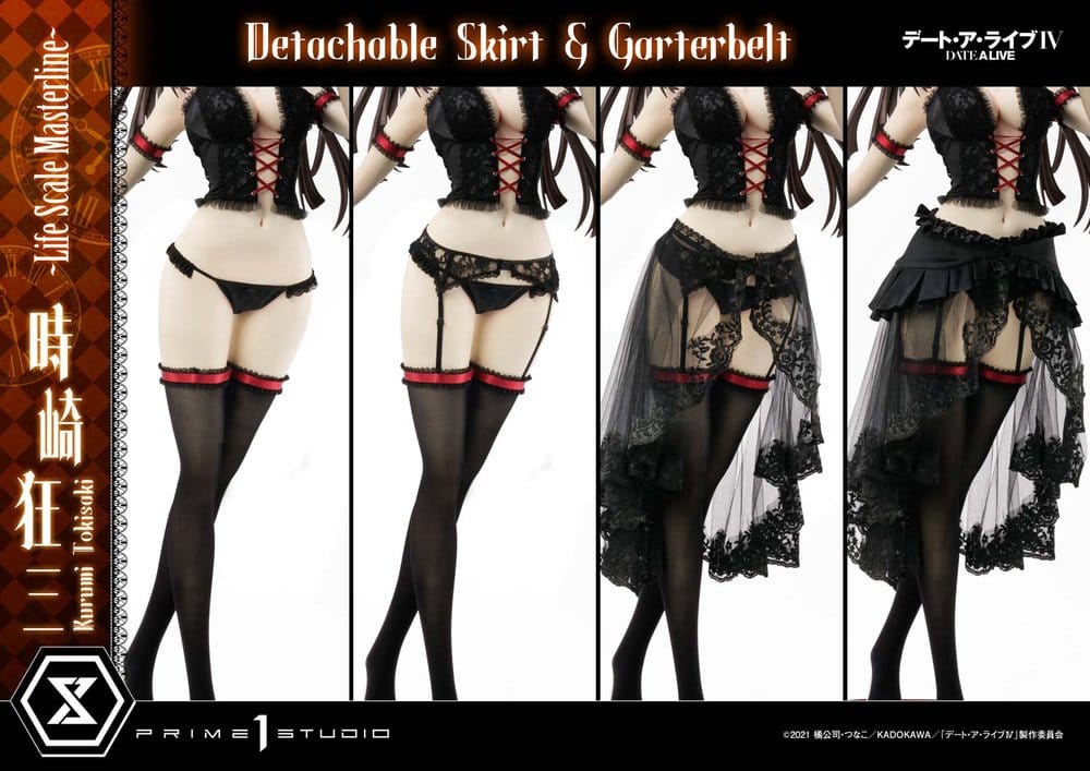 A golden left eye that keeps time. Black lingerie in elegant sway. "Nightmare" manifests as a life-size figure. From the TV anime series "Date A Live", Kurumi Tokisaki joins the Life Scale Masterline lineup in a lingerie look. Possessing overwhelming power to manipulate time, the "Nightmare" moves in the shadows for her enigmatic purpose. This life-size figure stands 162 cm tall, projecting her fleeting loveliness and the madness hidden within. A melting golden gradation in her left eye, twin tails flowing in uneven lengths, and a porcelain-like skin tone-every element that seems to form her demure pose has been brought to life with highly detailed sculpting and paintwork possible only at this scale. The body is also made of FRP (Fiber-Reinforced Plastic), a material that is lightweight yet strong. Resistant to aging, it lets you enjoy her beautiful presence for years to come. To capture even the natural creases that follow the contours of her body, the lingerie is tailored from real fabric. Sheer frills and lace give the black base a light, airy impression, while the glossy red ribbons add a refined accent. The headband, hand covers, and layered skirt are all removable-enjoy styling her however you like. Kurumi Tokisaki, manifested in life-size form. A collection piece to share your time with. Product Specifications: - DATE A LIVE-Themed Base - 1 x Headband - 2 x Hand covers - 1 x Layered Skirt