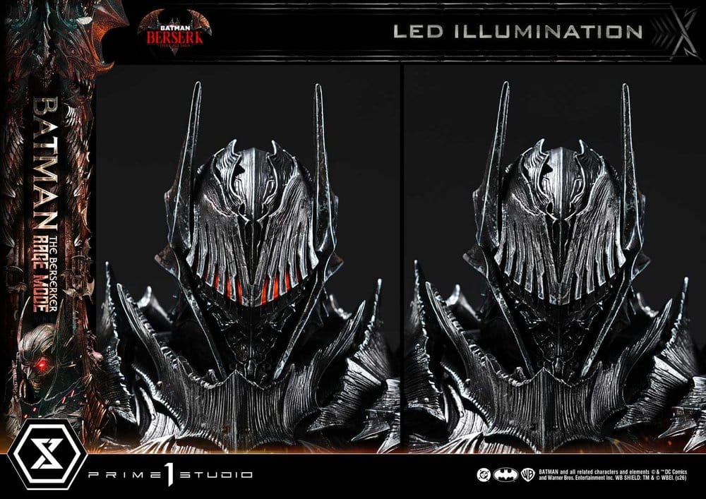 iA colossal axe strike brings judgment upon a world without justice. The enraged Dark Knight is given form in 1/4 scale. A new hero emerges within the DC Omniverse-Batman: The Berserker Rage Mode joins the Ultimate Premium Masterline lineup. Venturing alone through a world crawling with demons, Batman wields the power of darkness to strike down darkness itself. This statue gives form, at 1/4 scale, to the dark hero envisioned by Prime 1 Studio. Standing with the massive axe "Judgment of Faith"-a fusion of four weapons-in hand, the piece pursues a powerful silhouette and densely layered detail. The full-face head represents the Final Form of a helmet that transforms in response to surging emotion. Red LED illumination in the eyes expresses a rage on the verge of consuming reason itself. The armor, which binds the body like restraints, was crafted under the theme of dark protection, emphasizing a sinister presence. From the widely spreading cape, bats take flight, heightening the drama of the moment. At his feet lies Bane, transformed into a demonic creature and impaled by a sword. His unfocused eyes, rigid fingers, and the heavy presence of helmet and chains are rendered with meticulous attention to texture and color, capturing the realism of a final, dying scream. Deathbringer Sword, Spear of Justice, Phantom Axe, and Demon Slayer. All four weapons are also included in their pre-fusion forms. Combined with the First Form head, which reveals the mouth, and a left arm equipped with an extended wrist blade, you can create a variety of dramatic scenes. Presented by Prime 1 Studio, the enraged Dark Knight. Within your collection room, the curtain rises on a story arc that no one has yet witnessed. Product Specifications: - Batman: The Berserker-Themed Base - 2 x Swappable Heads (Final Form; First Form) - 5 x Swappable Right Arms (Judgment of Faith, Deathbringer Sword, Spear of Justice, Phantom Axe, Demon Slayer) - 2 x Swappable Left Arms (Bare Hand, Wrist Blade) - 1 x Head Stand - LED Illumination (Batman's Eyes) LED Power Supply Method: TBD * Please prepare batteries, USB cables, or other necessary items depending on the final power supply method. "