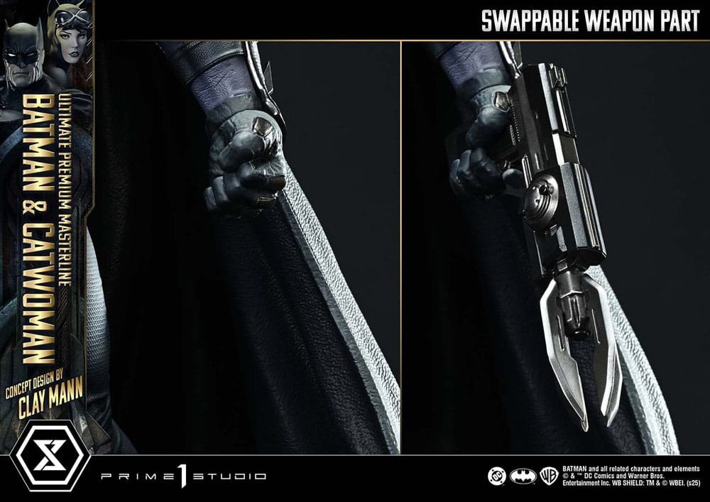 A portrait of two souls illuminated in Gotham's night. Clay Mann's lyrical concept, brought to life in three dimensions. Within a story where past, present, and future intertwine, "Batman/Catwoman" depicts the threshold of fate. From this poetic and visually sophisticated comic, the two protagonists-Batman and Catwoman-join the Ultimate Premium Masterline series. Shrouded in ominous light and shadow, the Dark Knight and the femme fatale stand together upon a Gotham rooftop. Inspired by the cover art of Chapter 2, this 1/4 scale statue embodies a concept designed by Clay Mann himself for Prime 1 Studio. Working closely with our artists, Clay contributed numerous ideas to craft the definitive interpretation of the pair. Their carefully adjusted gazes and subtle shifts in body direction capture the complex relationship that binds them. The muscular physique of Batman evokes anatomical precision, while optional parts allow him to hold his grapnel gun. Catwoman's form, defined by carefully studied bone structure and muscle balance, captures an elegant silhouette. Her whip has been meticulously crafted for a sharp yet fluid impression. Both characters' costumes feature deep, dark tones emphasizing gloss and shadow, and the base-engraved with ominous motifs-adds an air of grandeur. A work that elevates Clay Mann's lyrical concept into sculptural form. Displayed alongside the simultaneously released "Phantasm," it offers an even deeper glimpse into the world of "Batman/Catwoman." A must-have addition to any DC Comics collection. Size: approx. 56 x 51 x 31 cm Product Specifications: - Batman-themed Base - 2 Swappable Batman Left Hands (Bare Hand, Grappling Gun)