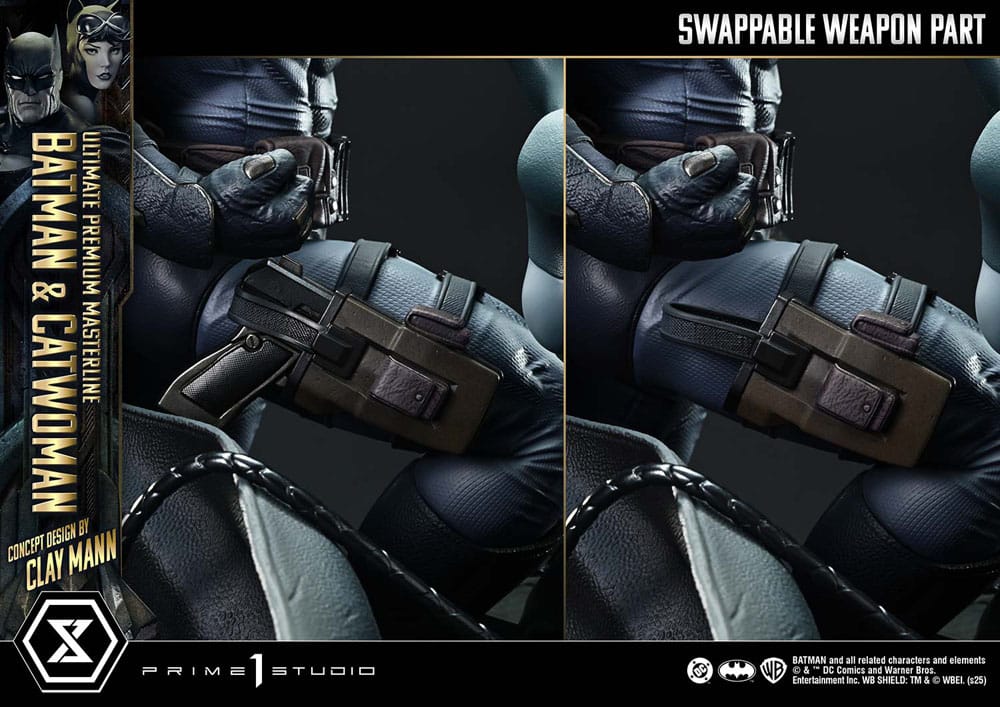 iA portrait of two souls illuminated in Gotham's night. Clay Mann's lyrical concept, brought to life in three dimensions. Within a story where past, present, and future intertwine, "Batman/Catwoman" depicts the threshold of fate. From this poetic and visually sophisticated comic, the two protagonists-Batman and Catwoman-join the Ultimate Premium Masterline series. Shrouded in ominous light and shadow, the Dark Knight and the femme fatale stand together upon a Gotham rooftop. Inspired by the cover art of Chapter 2, this 1/4 scale statue embodies a concept designed by Clay Mann himself for Prime 1 Studio. Working closely with our artists, Clay contributed numerous ideas to craft the definitive interpretation of the pair. Their carefully adjusted gazes and subtle shifts in body direction capture the complex relationship that binds them. The muscular physique of Batman evokes anatomical precision, while optional parts allow him to hold his grapnel gun. Catwoman's form, defined by carefully studied bone structure and muscle balance, captures an elegant silhouette. Her whip has been meticulously crafted for a sharp yet fluid impression. Both characters' costumes feature deep, dark tones emphasizing gloss and shadow, and the base-engraved with ominous motifs-adds an air of grandeur. The Bonus Version includes an additional Catwoman head portrait with goggles, inviting collectors to create a new story through display. A work that elevates Clay Mann's lyrical concept into sculptural form. Displayed alongside the simultaneously released "Phantasm," it offers an even deeper glimpse into the world of "Batman/Catwoman." A must-have addition to any DC Comics collection. Size: approx. 56 x 51 x 31 cm Product Specifications: - Batman-themed Base - 2 Swappable Batman Left Hands (Bare Hand, Grappling Gun) - 1 Swappable Catwoman Head (Serious) - 1 Swappable Catwoman Head (with Goggles) [BONUS PART] - 1 Catwoman Head Stand [BONUS PART] - Limited to 400 pieces