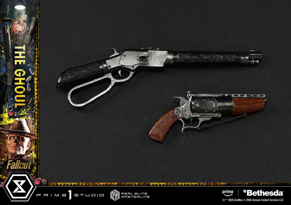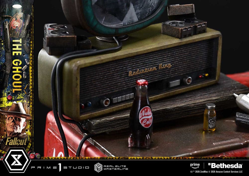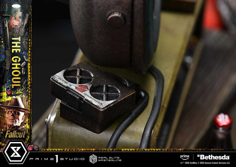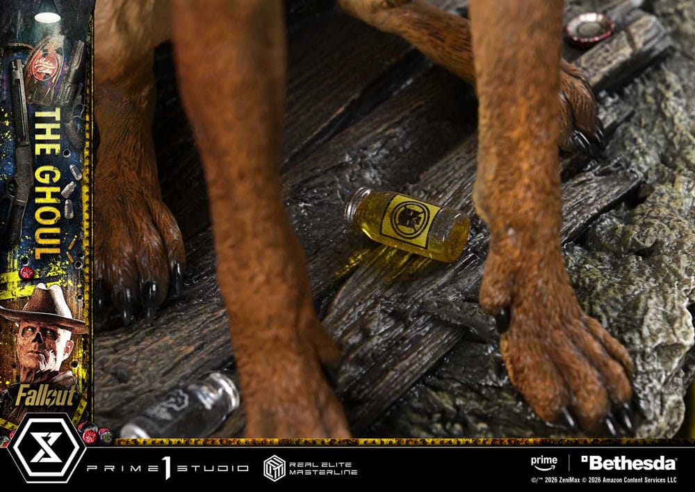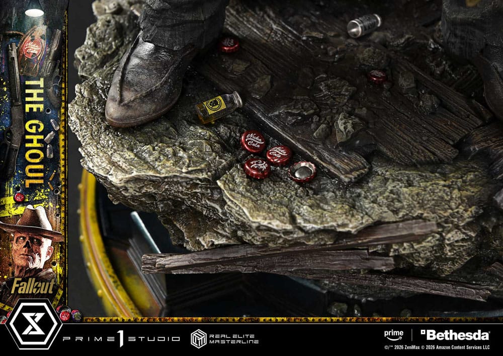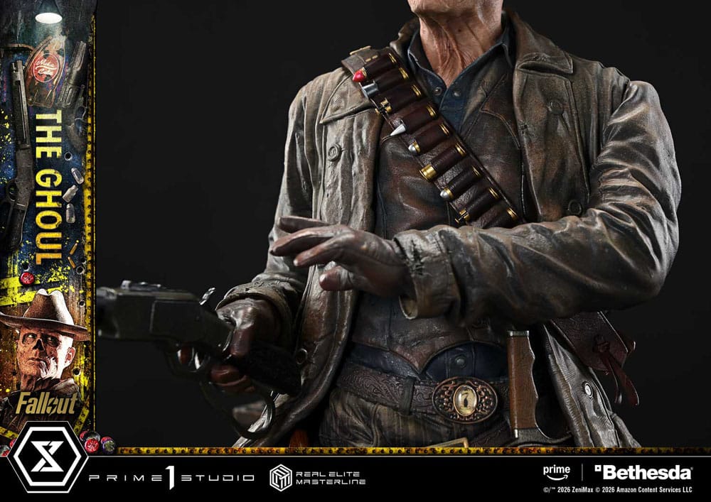 i" ""Well, maybe not, but I'm gonna make myself welcome."" A rogue bounty hunter, brought to life with the Wasteland's reality. Fallout is a post-apocalyptic ensemble drama where brutal violence and black humor swirl together. From the live-action adaptation of the long-running RPG comes one of its central figures, The Ghoul-now joining the Real Elite Masterline lineup. His presence, feared by all across the Wasteland, is captured with exquisite precision in 1/4 scale. The pose, aiming The Ghoul's Revolver from the hip, evokes the unforgettable shootout in Filly. From the arch of the torso to the fanning left hand, every detail has been refined to create a taut, suspense-filled balance. An exposed nasal cavity, parched skin, and a cold, ruthless glint in the eyes. Into this feral-worn portrait, we poured state-of-the-art sculpting and paintwork. From the frayed long coat to the glossy holster, his Western style is rendered with meticulous texture and aging. And with swappable parts, you can also arm him with The Ghoul's Lever-Action Rifle. The specially designed base is composed to reflect his outlaw way of life. Dogmeat standing close at his side. A weathered Nuka-Cola refrigerator. A television with an LED-lit screen showing pre-war star Cooper Howard. Each element draws a story into your display. Together with Lucy and Maximus, who will join the lineup in the future, this is a must-welcome addition to your collection. " Specifications: - Fallout-Themed Base - 2 x Swappable Right Hands for Raised (The Ghoul's Revolver, The Ghoul's Lever-Action Rifle) - LED Illumination (Television) LED Power Supply Method: TBD * Please prepare batteries, USB cables, or other necessary items depending on the final power supply method.