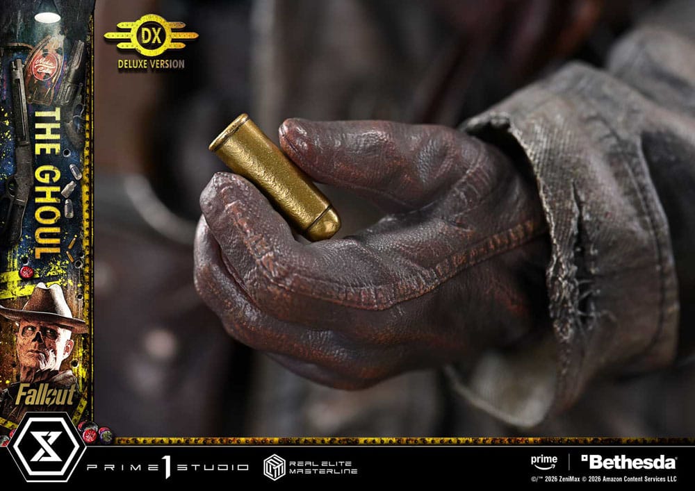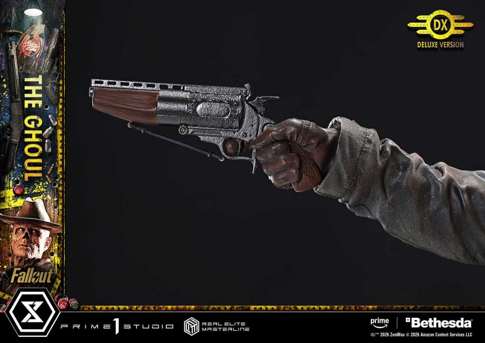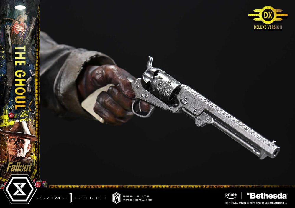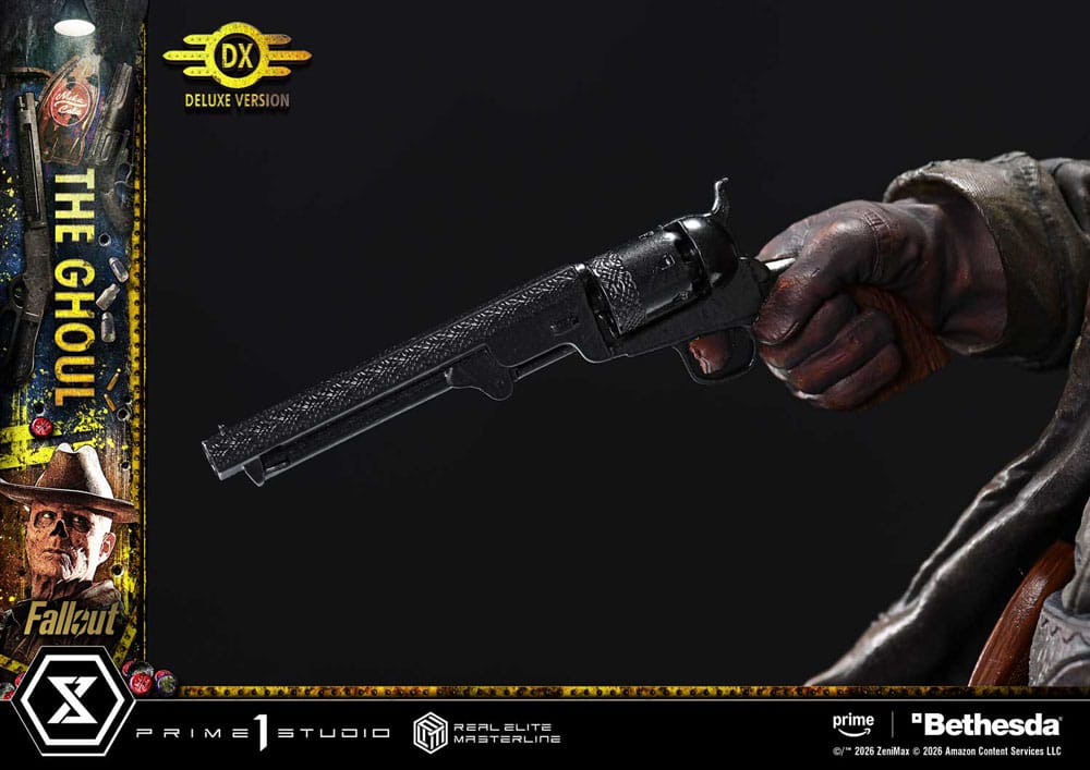 i"Well, maybe not, but I'm gonna make myself welcome." A rogue bounty hunter, brought to life with the Wasteland's reality. Fallout is a post-apocalyptic ensemble drama where brutal violence and black humor swirl together. From the live-action adaptation of the long-running RPG comes one of its central figures, The Ghoul-now joining the Real Elite Masterline lineup. His presence, feared by all across the Wasteland, is captured with exquisite precision in 1/4 scale. The pose, aiming The Ghoul's Revolver from the hip, evokes the unforgettable shootout in Filly. From the arch of the torso to the fanning left hand, every detail has been refined to create a taut, suspense-filled balance. An exposed nasal cavity, parched skin, and a cold, ruthless glint in the eyes. Into this feral-worn portrait, we poured state-of-the-art sculpting and paintwork. From the frayed long coat to the glossy holster, his Western style is rendered with meticulous texture and aging. And with swappable parts, you can also arm him with The Ghoul's Lever-Action Rifle. The specially designed base is composed to reflect his outlaw way of life. Dogmeat standing close at his side. A weathered Nuka-Cola refrigerator. A television with an LED-lit screen showing pre-war star Cooper Howard. Each element draws a story into your display. A rich set of additional parts further expands play value. Scanning the surroundings while taking aim. Reaching for the next round. Unleashing a storm of gunfire with black and silver single-action revolvers. Bring a wide range of gunfighting moments to life. Together with Lucy and Maximus, who will join the lineup in the future, this is a must-welcome addition to your collection. " Specifications: - Fallout-Themed Base - 2 x Swappable Heads (Right-Facing, Left-Facing) - 3 x Swappable Right Arms (Shooting from the Hip, Horizontal, Raised) - 3 x Swappable Right Hands for Shooting from the Hip (The Ghoul's Revolver, The Ghoul's Lever-Action Rifle, Single-Action Revolver [Black]) - 1 x Swappable Right Hand for Horizontal (The Ghoul's Revolver) - 2 x Swappable Right Hands for Raised (The Ghoul's Revolver, The Ghoul's Lever-Action Rifle) - 3 x Swappable Left Arms (Fanning, Shooting from the Hip, Lowered) - 2 x Swappable Left Hands for Shooting from the Hip (Single-Action Revolver [Silver], Cartridge) - 1 x Head Stand - LED Illumination (Television) LED Power Supply Method: TBD * Please prepare batteries, USB cables, or other necessary items depending on the final power supply method.