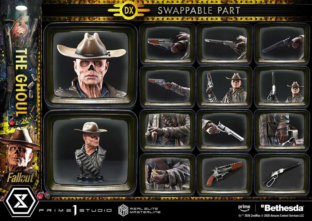 "Well, maybe not, but I'm gonna make myself welcome." A rogue bounty hunter, brought to life with the Wasteland's reality. Fallout is a post-apocalyptic ensemble drama where brutal violence and black humor swirl together. From the live-action adaptation of the long-running RPG comes one of its central figures, The Ghoul-now joining the Real Elite Masterline lineup. His presence, feared by all across the Wasteland, is captured with exquisite precision in 1/4 scale. The pose, aiming The Ghoul's Revolver from the hip, evokes the unforgettable shootout in Filly. From the arch of the torso to the fanning left hand, every detail has been refined to create a taut, suspense-filled balance. An exposed nasal cavity, parched skin, and a cold, ruthless glint in the eyes. Into this feral-worn portrait, we poured state-of-the-art sculpting and paintwork. From the frayed long coat to the glossy holster, his Western style is rendered with meticulous texture and aging. And with swappable parts, you can also arm him with The Ghoul's Lever-Action Rifle. The specially designed base is composed to reflect his outlaw way of life. Dogmeat standing close at his side. A weathered Nuka-Cola refrigerator. A television with an LED-lit screen showing pre-war star Cooper Howard. Each element draws a story into your display. A rich set of additional parts further expands play value. Scanning the surroundings while taking aim. Reaching for the next round. Unleashing a storm of gunfire with black and silver single-action revolvers. Bring a wide range of gunfighting moments to life. And the head with a nihilistic grin is an exclusive bonus for the DX Bonus Version. It looks ready to drop an unforgettable punchline. Together with Lucy and Maximus, who will join the lineup in the future, this is a must-welcome addition to your collection. " Specifications: - Fallout-Themed Base - 2 x Swappable Heads (Right-Facing, Left-Facing) - 3 x Swappable Right Arms (Shooting from the Hip, Horizontal, Raised) - 3 x Swappable Right Hands for Shooting from the Hip (The Ghoul's Revolver, The Ghoul's Lever-Action Rifle, Single-Action Revolver [Black]) - 1 x Swappable Right Hand for Horizontal (The Ghoul's Revolver) - 2 x Swappable Right Hands for Raised (The Ghoul's Revolver, The Ghoul's Lever-Action Rifle) - 3 x Swappable Left Arms (Fanning, Shooting from the Hip, Lowered) - 2 x Swappable Left Hands for Shooting from the Hip (Single-Action Revolver [Silver], Cartridge) - 1 x Head Stand - LED Illumination (Television) - 1 x Swappable Head (Smiling) [BONUS PART] - 1 x Head Stand [BONUS PART] LED Power Supply Method: TBD * Please prepare batteries, USB cables, or other necessary items depending on the final power supply method. - Limited to 400 pieces