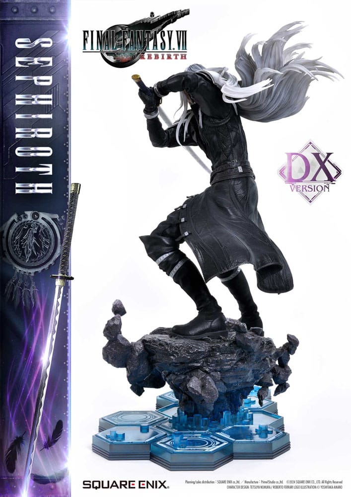 A coal-black wing that flutters among the stars, and a vengeful blade that brings about disaster. Sephiroth from FINAL FANTASY VII REBIRTH appears as a 1/4 scale statue, perfected in 3D. SQUARE ENIX and Prime 1 Studio have teamed up again to bring you the high-end collectible SQUARE ENIX MASTERLINE. Sephiroth, the one-winged angel from FINAL FANTASY VII REBIRTH, is brought to life in this statue series attracting attention from collectors all around the world! The elongated sword brimming with silent menace alongside his poised stance directly capture Sephiroth's disposition when you face him in the game. Closely analysing his scenes from the game, this figure is a 1/4 scale representation of the distinctive pose that everyone remembers. Long silver hair that flows behind him, eyes of Mako stained with madness, Masamune that can surely captivate anyone's heart with its beautiful blade pattern, and a coal-black wing that extends from his right shoulder - the colouring and sculpting of this figure are full of elaborate touches, and the craftsmanship pursuing only the best is alive and well in every detail and form. The blue hexagons that fill the bottom of the special base are also used in the Cloud Strife and Zack Fair statues from the same series, so you can enjoy a unified display by placing them side-by-side. Deluxe version comes with the extra upper body with no wing on his back, allowing you to display Sephiroth in a way that recalls the glory of the legendary 1st Class SOLDIER. You can feel the rich narrative behind the character from the exquisite sculpting and colouring of this masterpiece. Demanding the very best in every aspect, Sephiroth is sure to dominate your collection with his overwhelming presence Material: Polystone / Some parts utilize other materials Approx product size: 69 x 41 x 72 cm Included Parts: - 2 x Upper Body x 2 - Special Base - FINAL FANTASY VII REBIRTH Logo Stand - Support Column