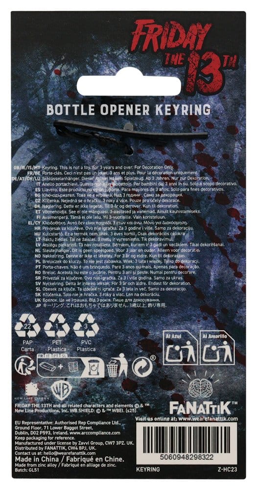"Open your bottles with a little bit of help from Jason! Finished in a sleek black nickel plating, this chunky metal opener shows off all the eerie details of the Jason Voorhees' iconic hockey mask while doubling as a handy everyday accessory. Clip it to your keys, your bag, or your survival kit... because you never know when you'll need a bottle opener. It measures a satisfyingly chunky 73 × 69 mm and is perfect to show off your love of horror movies! - Officially licensed - Black nickel plating - Size 79 x 60mm"