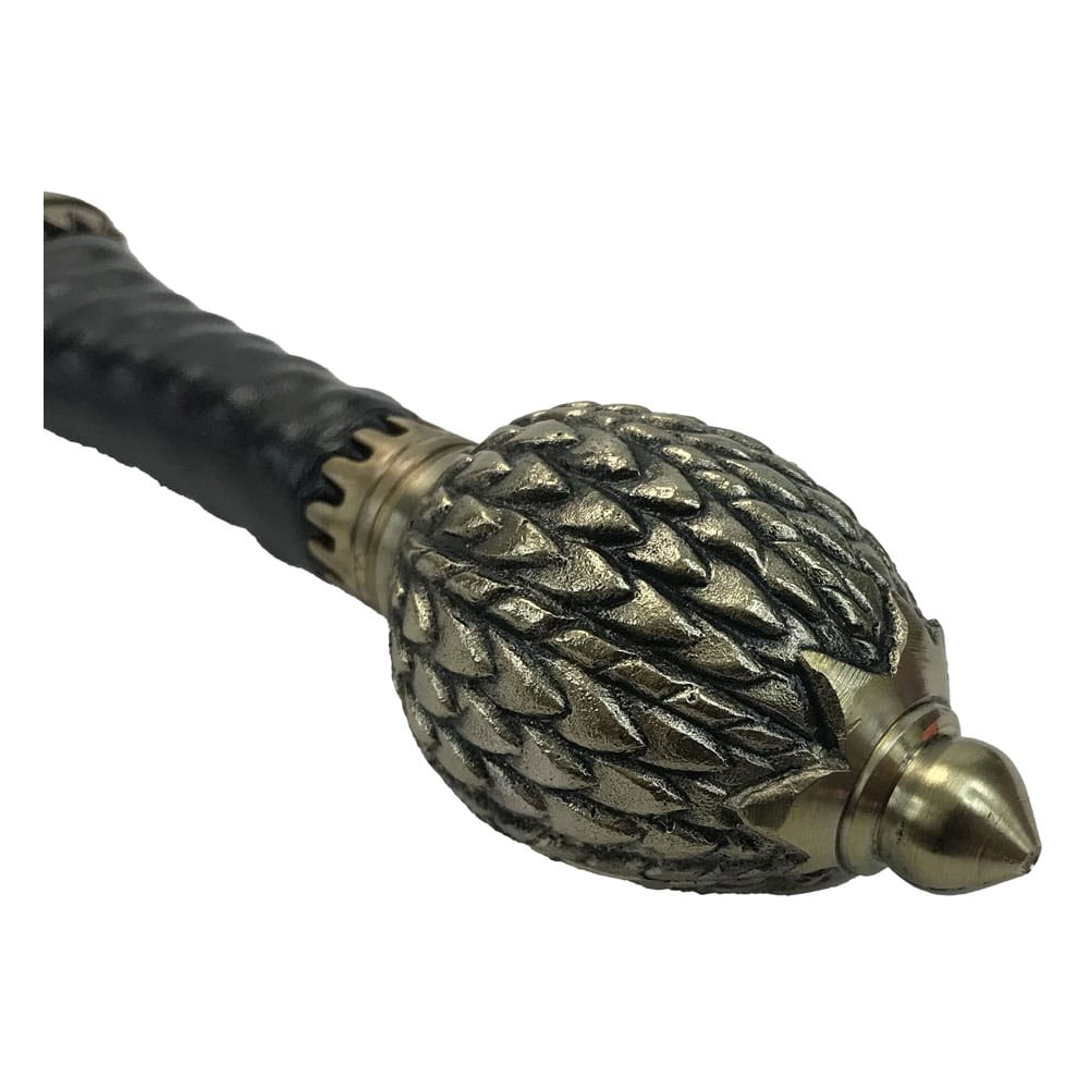 i"He can keep his tongue!" Daemon Targaryen Dark Sister is one of the ancestral Valyrian blades of House Targaryen. Passed down through the hands of many prominent members of the Targaryen line, its origins date back to an ancient time, prior to the conquests of Aegon I. Designed with a narrow blade, the sword is intended to inflict quick and critical wounds. As wielded by Daemon Targaryen, it is a much-feared weapon. Tim Lewis, Master Armorer for House of the Dragon, contracted world-renowned swordsmith Peter Johnsson to make the original Dark Sister hero prop. A true master of his craft, Peter is also a historian with unparalleled knowledge of the ancient art of sword making. His expertise imbued Dark Sister with an authentic sense of character and heritage. The Factory Entertainment Dark Sister prop replica was created after careful study of the hero prop. Our team interviewed both Peter Johnsson and Tim Lewis, who each provided a wealth of previously unseen behind the scenes information including details and photographs of the construction of the original prop. We are very grateful for their assistance and input. Each replica has been created using similar traditional techniques to the original hero prop, including lost-wax casting. Similar materials have also been chosen including wood, leather and metal. To replicate the appearance of the Damascus steel blade used on the hero prop, the Factory Entertainment team elected to use high quality En42 spring steel with a pattern that has been chemically etched into the blade. Each replica includes a sequentially numbered wall hanging plaque and is presented in a full color box with a certificate of authenticity. Edition Size: 500 Pieces.