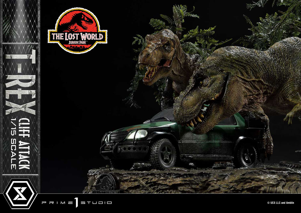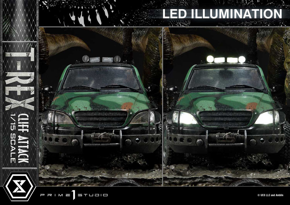 i"The T-Rex exists on this planet for the first time in tens of millions of years and the only way you can express yourself is to kill it?" - Nick Van Owen Prime 1 Studio is proud to present an amazing addition to our Legacy Museum Collection Jurassic Park Series of statues: the 1:15 Scale LMCJP-09S: T-REX CLIFF ATTACK BONUS VERSION from THE LOST WORLD: JURASSIC PARK! This breathtaking 21-inch-tall T-Rex Cliff Attack Bonus Version diorama statue portrays a pivotal moment in the film where Eddie Carr is trying to save Dr. Ian Malcolm and Dr. Sarah Harding, from plummeting to their deaths into the cold, dark seas of Isla Sorna! But fate has another plan for Eddie for the T-Rexes have arrived! Prime 1 Studio has chosen this tense, life-or-death situation as the moment to immortalize in T-Rex Attack! Prime 1 Studio's sculptors have composed an elaborate diorama scene which finds two adult T-Rexes at the moment they realize that there's a delicious snack to be had inside this curious, metal container. Prepare to be fully immersed in this pulse-pounding scene, as you take in all the textures, colors, and environmental details of this breathtaking diorama. Each T-Rex was sculpted by a master studio sculptor, and imbued with powerful theropod life, to illicit the exact emotions a 15,000 pound, 40 foot dinosaur would illicit. In this diorama, they have been stalking, and have walked up to a miniscule contraption, attracted by the noise and movements inside. The T-Rex couple and the Jurassic Park SUV with LED-Powered Lights inhabit a lush, wet portion of Isla Sorna, situated dangerously close to a cliff. Observe the quality of the trees, the plants, mud, and water puddles. The way the glossy finish of the rain makes the scales and muscles of the T-Rexes look. The careful, exacting painting style of the Studio is clearly evident in how well this moment is rendered. This fantastic diorama is finished off with a wonderful platform depicting fossilized dinosaur skeletons, encased within the Earth...where they were less dangerous! And when you pre-order this Bonus Version from our official online store or any authorized distributor will you receive a cool, extra Bonus Part: an adorable T-Rex Baby Dinosaur on her own base! She's the very thing her parents were looking for! Add to your family of Jurassic Park statues now by Pre-ordering this fantastic LMCJP-09S: T-Rex Cliff Attack Bonus Version from The Lost World: Jurassic Park! [Product Specifications] - Statue Size approx. 21 inches tall and 69 inches wide [H:53cm W:69cm D:99cm] - LED illumination on Jurassic Park Sport Utility Vehicle - Isla Sorna Cliffside-inspired Environmental Base - One (1) Freestanding T-Rex baby on her own Base [BONUS PART] - Limited to 500 pieces