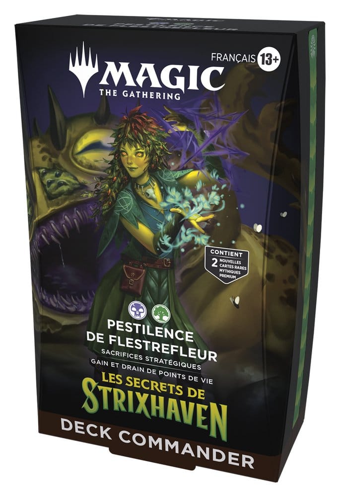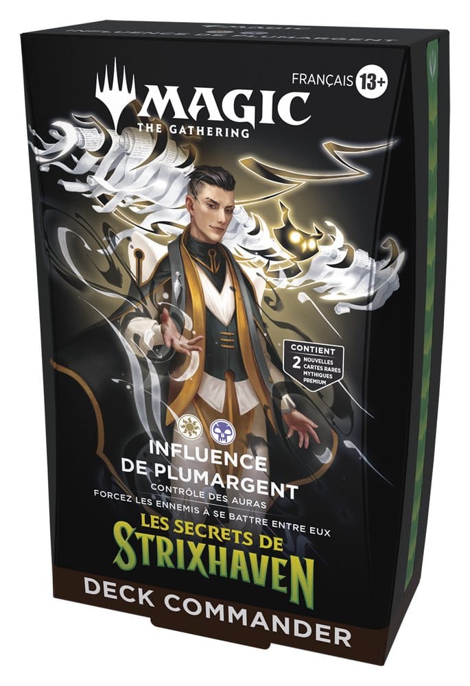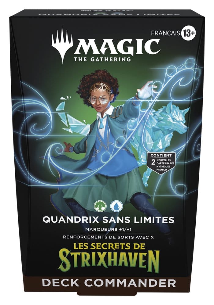 This bundle includes all 5 Magic: The Gathering Secrets of Strixhaven decks: Silverquill Influence, Prismari Artistry, Witherbloom Pestilence, Lorehold Spirit, Quandrix Unlimited. Each includes 1 deck of 100 Magic cards (2 Traditional Foil Borderless cards, 98 regular cards), 10 double-sided token cards, 1 deck box (can hold 100 sleeved cards), 1 strategy guide, and 1 reference card.