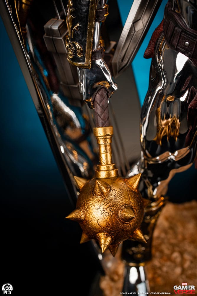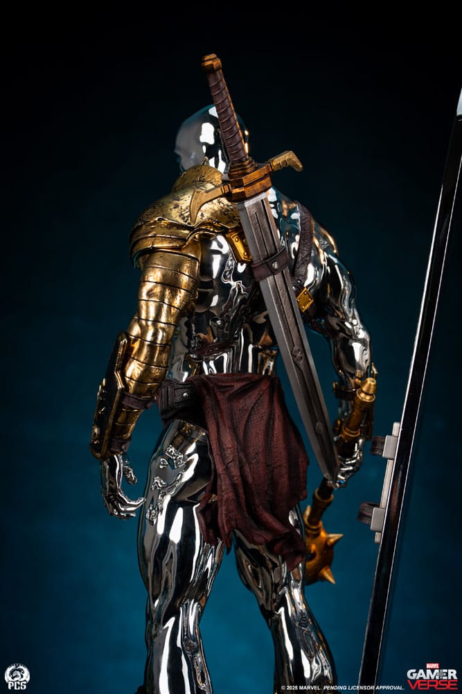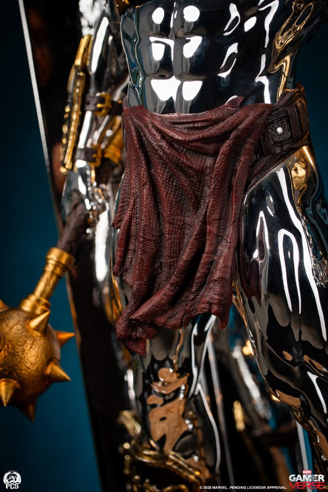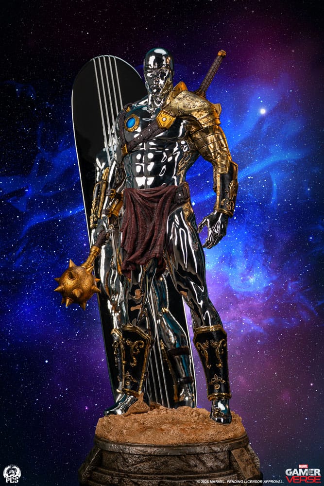 iPremium Collectibles Studio proudly presents the Silver Surfer - 1:3 Scale Statue, inspired by the interstellar herald's gladiator variant in the smash hit mobile game, Marvel Snap! Standing an impressive 30.5" tall, this beautiful collectible captures the stoic intensity of the Silver Surfer armed to battle against his will, (thanks to the blue control disc fixed to his chest) in the fighting pits of Sakaar. This popular rendition of the classic Marvel character is decked out in an assortment of armor and weapons cobbled together from the arena's makeshift arsenal. The bulky bronze pauldron on his left shoulder is pitted with damage and connects to an array of straps that also acts as a sheath for the massive great sword on his back. His ornately decorated gauntlets and greaves, along with a reddish-brown loincloth give this galactic traveler a distinctly Roman look, fitting for the massive arena he's held captive in. The Silver Surfer himself is covered in a dazzling, reflective chrome finish from head to toe. The finish appears even brighter when set against the battle worn armor and weapons he is adorned with. In his right hand he wields a spiked mace while behind him his iconic surfboard, fashioned into a makeshift shield, juts out from the base which has been sculpted with a realistic sand-like texture to recreate the feel of the harsh terrain. Set a course for adventure and add the Silver Surfer 1:3 Scale Statue by PCS to your Marvel Gamerverse collection today! Limited Edition: 250 Pieces Size: 77 x 39 x 32 cm