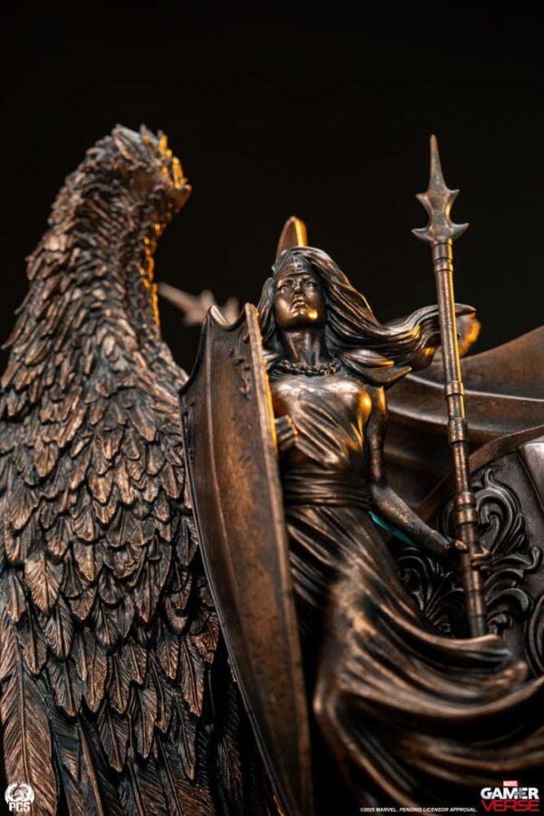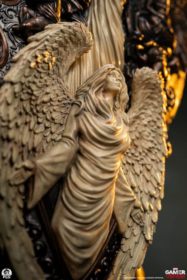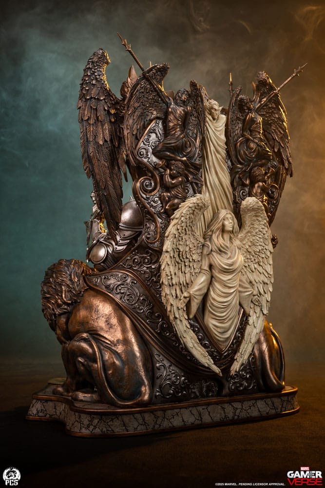 Premium Collectibles Studio is proud to present the Dr. Doom 1:3 statue, inspired by the classic character's appearance in the hit video game, Marvel Rivals! This beautiful collectible, measuring nearly 27" tall, features Dr. Doom seated in an intricately sculpted throne decorated with realistic metallic finishes. Doom's detailed Marvel Rivals design is beautifully realized here capturing all of the bespoke metal work and runic carvings seen throughout his armor. His classic green tunic and hood is updated here with the addition of a white fur collar and futuristic belts and clasps. Doom's left gauntlet also features an exciting LED light up feature. The throne Doom sits upon is packed with details as well. On either side of the metallic monarch are a pair of majestic lion sculptures, while behind him, making up the backrest of the throne are a pair of winged warriors brandishing spears and shields. These elements are painted in a faux bronze finish giving the seat an ancient, otherworldly appearance. On the backside of the throne are a pair of figures with a weathered stone finish offering an interesting contrast to the darker bronze elements. Break free from the shackles of time and add the Dr. Doom 1:3 Statue by PCS to your Marvel Gamerverse Collection today! Size: 69 x 51 x 51 cm