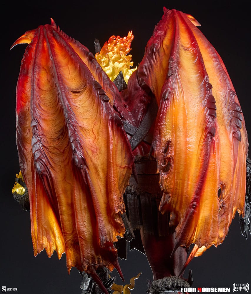 Sideshow presents the Arethyr: War Statue, a fully sculpted collectible inspired by the hellish action figure from Mythic Legions by Four Horsemen Studios. The embodiment of war itself, Arethyr leads a legion of brutal warriors. His mystical weapon the Aetherblade burns brightly at his side as he seeks to reunite his malevolent siblings and lay waste to Mythoss with fire and fury. The Arethyr: War Statue measures 20.6" tall x 23.44" wide x 13.3" deep, capturing this hellion's hunger for battle. The warmonger brandishes the flaming Aetherblade sword as he storms over a field of broken armaments and fallen fighters. His devilish form exudes brute strength, with leathery wings poised to unfurl. Arethyr is protected by wicked black armor forged in the ruthless fires of conflict, with monstrous horned pauldrons on either shoulder and a matching belt ornament across his waist. His grimacing portrait is guarded by a cage-like mask, crowned with a blazing tongue of fire. Will you pledge your sword to his merciless cause? Bring home the Arethyr: War Statue today. Size: 53 x 60 x 34 cm