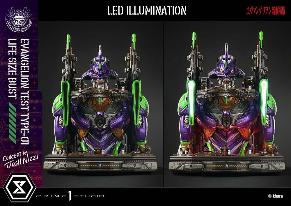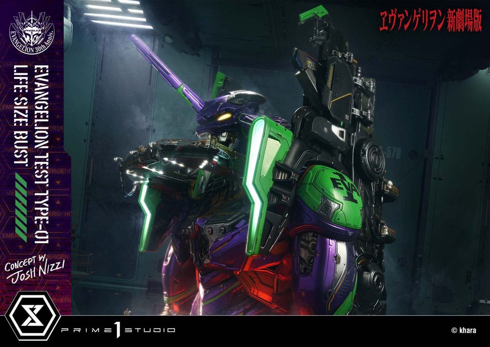 A silent ripple of L.C.L. A layered drama of humanity. An artificial human awaits activation-captured in a life-size bust. Known for his work on numerous films and games, mechanical concept artist Josh Nizzi brings new depth to iconic characters through the "Concept By Josh Nizzi" lineup. Now, Evangelion Unit-01 joins the series as a life-size bust. Three years after the release of the diorama reimagining Unit-01's first battle, this piece emerges as a spin-off that inherits the same core design concept as the previously released "Fourth Angel." While the earlier work focused on "motion" and "what has happened," this bust expresses "stillness" and "what is about to happen." Depicted in restraint, Unit-01 awaits deployment-rendered with intricate and dynamic craftsmanship at an imposing height of 86cm, reminiscent of a human torso. The commanding presence of Unit-01 and the surrounding human narratives are brought to life through meticulous sculpting and painting. From the multi-layered armor panels with varied sheens to the weathered textures and the organic gloss inside its open jaw, every detail enriches the upgraded scale with visual density. The shoulder pylons feature articulated mechanisms that allow for an open-and-close display, adding another layer of realism. Even the restraints and maintenance decks appear more worn than Unit-01 itself. Staff figures, stationed on two levels of the deck, each strike a pose that hints at their own story. At the base, gently rippling L.C.L silently evokes the world they inhabit. The built-in LED effects breathe subtle life into the quiet Unit-01. Yellow lights glow from its eyes, cool white glimmers along its shoulders, and a red hue filtered through the L.C.L stirs the viewer's imagination. Born of a cutting-edge design, this colossal bust captures a mythic moment between human and artificial being-now brought into your collection space. Specifications: - 2 x Shoulder Pylon Hatch Sets (Open, Closed) - LED Light-Up Feature (Eyes, Shoulders, Maintenance Deck and L.C.L) LED Power Supply Method: TBD * Please prepare batteries, USB cables, or other necessary items depending on the final power supply method.