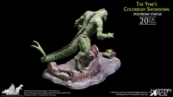 Star Ace presents: The Ymir's Colosseum Showdown - A Ray Harryhausen Tribute. Step into the thrilling finale of 20 Million Miles to Earth (1957) with this intricately crafted polyresin diorama, recreating the Ymir's legendary clash against military forces in the heart of Rome. Standing 20cm tall, the alien creature is in a dynamic pose, its textured scales and fierce expression meticulously sculpted to mirror Ray Harryhausen's original stop-motion marvel. Below, tanks takes aim at the beast, framed by the iconic arches of the Colosseum - a haunting blend of ancient ruins and 1950s sci-fi spectacle.