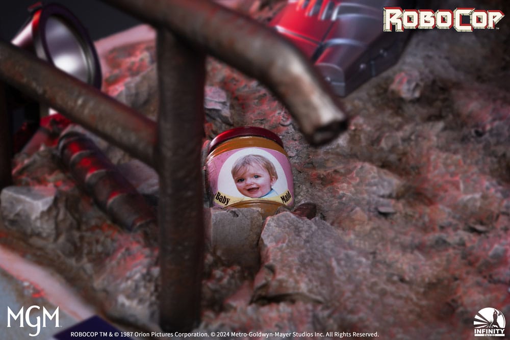 iThe iconic sci-fi action film Robocop (1987) left a deep impression on fans worldwide. The movie follows the story of Murphy, a Detroit police officer tragically killed in the line of duty. Scientists in Detroit save him by merging his brain with a mechanical body, creating Robocop, a hybrid of human intelligence and mechanical strength dedicated to preserving peace and fighting crime. Infinity Studio brings this legendary character to life with the Robocop 1/2 Silicone Statue, allowing fans to relive the movie's most memorable moments and honor this timeless classic. "Dead or alive, you're coming with me." Face Sculpture: Crafted with top-grade platinum silicone, the face under the helmet is meticulously sculpted to capture Robocop's cold and resolute expression, faithfully reproducing his on-screen appearance. Armor: The armor faithfully replicates the movie's design, including hand-crafted details true to the original props. For the first time, automotive-grade surface finishing technology has been applied, giving the armor a smooth, mirror-like finish, showcasing impeccable craftsmanship. The armor features chameleon paint that shifts color under different lighting, adding a futuristic appeal. Body: Ingeniously designed arm joints allow for six adjustable angles, offering a variety of heroic poses to display Robocop's bravery. Base: The base design incorporates elements of the antagonist robot ED-209, including a cleverly integrated wanted poster. Size: 77 x 52 x 112 cm Material: Medical Platinum Silicone, Polystone, Fiber, Fabric, PVC Limited Edition of 399 pcs worldwide.