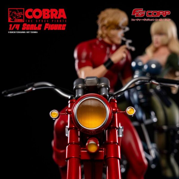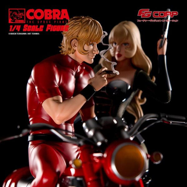 Immerse yourself in the legendary world of COBRA, one of the most daring and charismatic heroes of Japanese animation, straight out of the imagination of Master Buichi TERASAWA, with this exceptional 1/4 scale figure. Capturing the adventurous spirit of our hero and the explosive energy of the original work, this true work of art in resin depicts COBRA on his famous motorbike, accompanied by the splendid JANE ROYAL, in a spectacular "Spacesuit" version that will leave you speechless. COBRA on his motorbike: a faithful reproduction of one of the most memorable elements of the series. His posture, confident and dynamic, tinged with his legendary arrogance, brings out all the power and charisma of the famous pirate. Obviously, the French touch will not have escaped anyone: our cosmic James Bond is a vibrant tribute to Jean-Paul Belmondo. We have redoubled efforts to capture the essence of the character intended by the master TERASAWA. The details of the motorbike, with its futuristic lines and impeccable finish, add a breathtaking touch of realism. Cigar in hand, defiant smile, exposed psychogun... COBRA is the king of cool! Limited to 150 pieces!