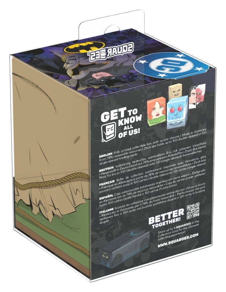 Collectible box for storing TCG decks, tabletop gaming accessories, and/or collectibles. The Scarecrow Squaroe from the Batman: Gotham City edition holds up to 100 cards in double protective sleeves if used as a deck box. Squaroes are made from 78% renewable resources and fit perfectly into the separately available Collectors Case.