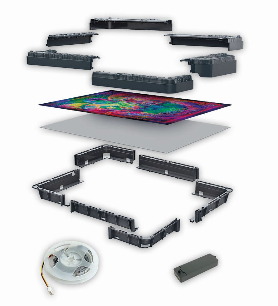 iDiscover the entire Metamorphic Art Collection and choose your favourite image to immerse yourself in the world of Stranger Things. The image shows Elfi, all the characters and the Mind Flyers terrorising Will's family, one after the other. Put the puzzle together, build the frame, turn off the lights and turn on the LED to experience something unique. The product includes: 520-piece puzzle (49 x 36 cm), cardboard box, glue, frame to assemble, electrical module, LED RGB strip, poster with the image and instructions. When the light is on, you can see three layers of colour in the image. When the light is off and the LED is on, you can see the image that corresponds to the colour of the LED. - Officially licensed puzzle - 520 pieces - Dimensions: 49 x 36 cm