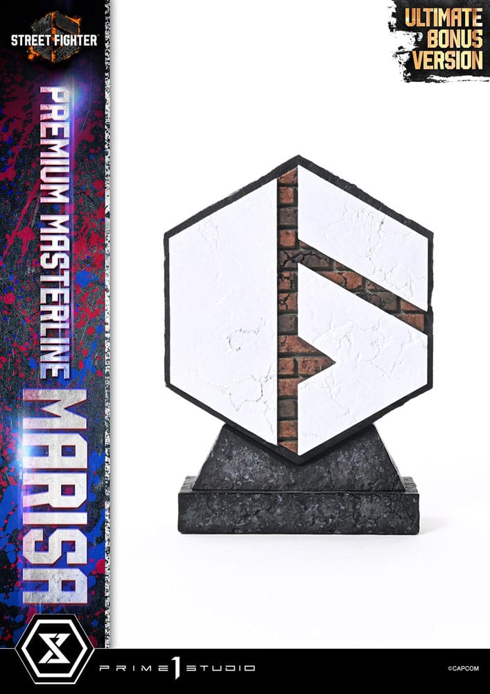 iWith Stunning Sculpting and Painting, the Fearless Pankratiast Strikes at the Heart! As additional characters continue to join the fray, Street Fighter 6 continues to build excitement. From this highly acclaimed title comes Marisa, brought to life in 3D by Prime 1 Studio's Premium Masterline series! Making her debut in Street Fighter 6, Marisa, the Pankratiast, swiftly captured the hearts of players. Now, her bold and daring appeal is fully embodied in this stunning statue. The hair, reminiscent of an ancient Greek helmet, has been carefully crafted to capture the perfect color and flow. Her confident expression is accurately recreated, right down to the glossy lips and the beauty mark near her left eye. The powerful muscles covering her body tell the story of her incredible strength, while the bulging veins and flushed skin add a touch of realism. Her finely detailed costume and accessories reflect her jewelry designer's touch. The base, featuring a sword and shield plunged into the ground, and flower petals drifting down, is inspired by the Colosseum stage. Pink LEDs and graffiti on the shutter add a street-style flair, drawing you into the world of the game. The Ultimate Bonus Version comes with various head and arm parts, allowing you to recreate Marisa's signature Goddess of the Hunt move, where she kisses her fist. You can also use the effect wall and head stands to create your own unique display combo. As a bonus for this version, a character graffiti logo stand is also included, bringing the hip-hop vibe of the game to your display. With the combination of artistry in painting, sculpting, and features, Prime 1 Studio's Critical Arts will strike right at your heart with their passionate love for Marisa! Product specifications: - Street Fighter 6 Themed Base?(with LED Illumination) - 3 x Swappable Heads (Serious, Kiss, Helmet) - 4 x Right Arms (Flexed, Holding Helmet, Kissing Fist, Relaxed Arm) - 2 x Head Stands - 1 x Effect Wall - 1 x Marisa Graffiti Logo Stand [BONUS PART] - LED Power Supply Method: TBA * Please prepare batteries, USB cables, or other necessary items depending on the final power supply method.