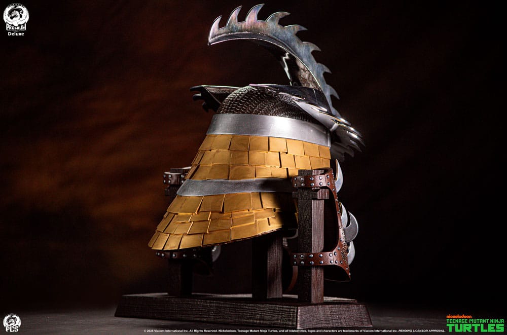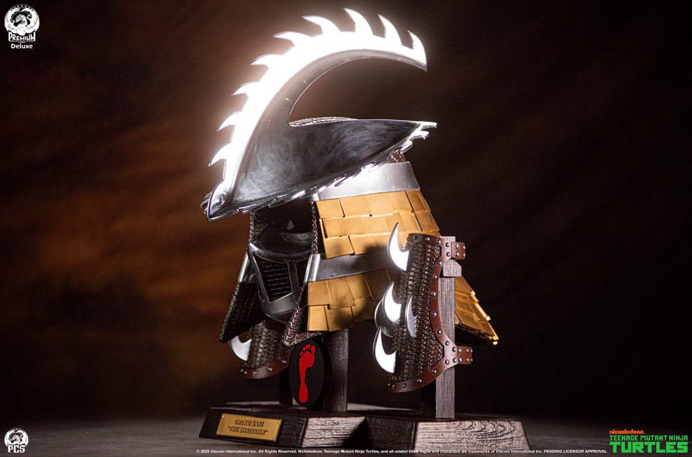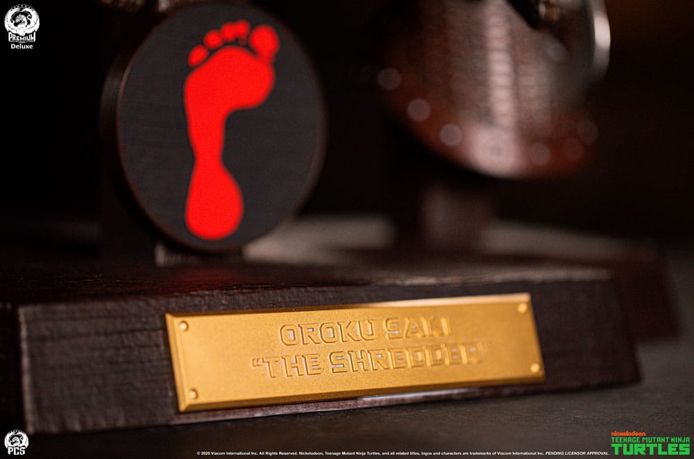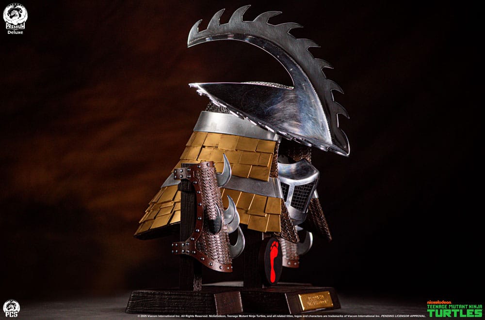 Premium Collectibles Studio is proud to present the Shredder Life-Sized Electroplated Armor Set - Ooze Edition, an exciting new collectible that gives fans the opportunity to display this outrageous armor in their own secret lair. Standing 25" tall displayed on a 21.5" wide base the Ooze Edition showcases the leader of the Foot Clan's upgraded armaments including his helmet with additional serrated edges and gold embellishments as well as a pair of matching bracers. The set is arranged neatly on a faux-wooden base with a metallic name plate and crimson Foot Clan logo to elevate your TMNT display to museum status. Add some serious edge to your TMNT collection and pick up the Shredder Life-Sized Electroplated Armor Set - Ooze Edition by PCS today. Product Size: 63 x 55 x 50 cm Please Note: Available as Electroplated and Stainless Steel editions. While the final production materials will be different, the appearance of both versions are the same.