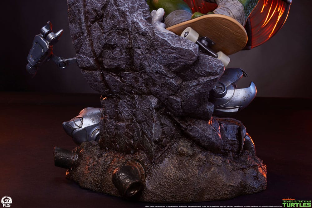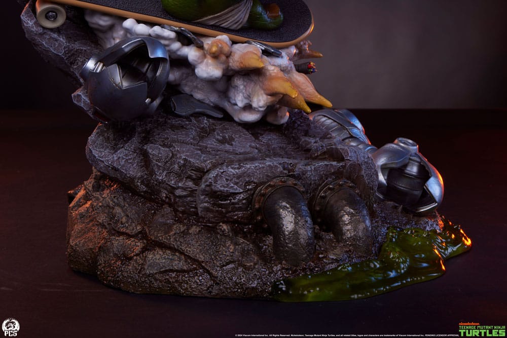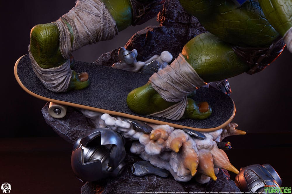 Premium Collectibles Studio presents the Michelangelo 1:3 Scale Statue, the last of the four brothers to make his way into the TMNT Legends 1:3 Scale Statue collection. Designed by the Kucharek Bros., this line was inspired by the many iconic appearances of the Ninja Turtles over the last 35 years. The Michelangelo 1:3 scale statue measures 26.5" tall and nearly 19" wide as this fun-loving turtle whirls his nunchucks while carving through the NYC sewer system on his skateboard. The Michelangelo statue is carefully crafted to showcase a stylized mixture between his more realistic and comic styled depictions. With detailed paint work and design, you can see each scale on his body, every cut of his shell, and his battle-hardened physique from his many clashes with the TMNT rogues' gallery alongside his brothers Leonardo, Raphael, and Donatello. This fully sculpted statue features protective pads on his knees and elbows, cloth wraps around his hands and feet, and a leather belt decked out with a ton of pouches to hold his ninja accessories...or more likely, snacks. The wide grin on his face and his orange mask fluttering in the breeze enhance the sense of movement and fun that makes Michelangelo such a fan favorite. Add some fun to your TMNT Legends collection and bring home the Michelangelo 1:3 Scale Statue by Premium Collectibles Studio today! Product Size: 67 x 47 x 41 cm
