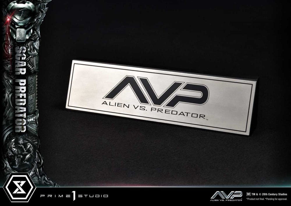 "The enemy of my enemy is my friend..." - Alexa Woods, to Scar It has been almost twenty years since Alien vs. Predator, also known as AVP, was released and blessed both Aliens and Predators franchise fans, pitting the creatures against each other in an action-packed, sci-fi horror film. Prime 1 Studio is excited to present our next entry to the Predators grand family, joining the Museum Masterline Series, the 1/3 Scale MMPR-04DXS Scar Predator Deluxe Bonus Version from the 2004 film Alien vs. Predator! In this incredible crossover blockbuster, Scar and his brothers Celtic and Chopper were all sent to Earth to undertake an initiation Hunt in an ancient pyramid buried beneath Antarctica. The pyramid served as a hunting ground, where Predators used Aliens as prey in order to graduate from Young Blood Yautjas to Blooded Yautja, thus being considered an adult and a full member of its Clan. Let us look closer at Scar, the youngest of the three Predator brothers. Once again, the incredible artisans at Prime 1 Studio brought their A-game to bring this imposing and fearsome extraterrestrial hunter to life. At a whopping 36 inches tall, Scar is fully armored and equipped with an arsenal of advanced technology and brutal instruments of death. As usual, the immense dedication and attention to detail from our artisans and sculptors that went into crafting this remarkable Predator statue ensures the utmost level of accuracy. From each single strand of dreadlock to the tiny Xenomorph skulls and the shading of the skin and armor. You will definitely see and feel our commitment to perfection with this piece! The iconic Bio-Mask, features a distinctive mark on the forehead, referring to his name "Scar". The Plasmacaster is ready to unleash its devastating energy blasts on any prey that's unlucky enough to be targeted by the helmet's targeting lasers, both of which are LED illuminated a bright blue and red, respectively. He holds in his right hand the Combistick, a spear-like weapon that serves to impale victims from a distance. In contrast, the gauntlet-integrated Wristblade, in its retracted state, is designed for close-quarters combat, allowing him to slice through flesh and bone with brutal efficiency. His left hand is equipped with a massive Shuriken, absolutely lethal when thrown. The Wrist Gauntlet is also equipped with LED illuminating functions. The base features ancient Yautja-constructed ruins and the corpse of a Facehugger that has been freshly slain. We have also included a second head, without the Bio-Mask to display Scar's true face, and a head base for display. A silver "AVP" logo plate is also included for display at the statue's base. The Deluxe Version will allow you to mix and match a series of additional hand parts to find the perfect display to your liking. Two additional right-hand parts are included, one closed fist and one open palm. Two additional Wristblade lengths for the right gauntlet allow you to either fully or partially extend the deadly blades. The left hand comes with two additional open palm variations and an additional third head part featuring Scar's visage as he roars. A second headstand and logo plates are included for you to display. And when you order the Deluxe Bonus version from our official store or any authorized distributor, you will receive additional parts to expand your storytelling: an additional Bio-Mask head part without the scar on the forehead, an additional right hand holding a ripped-out Inner mouth of a Xenomorph, an additional left hand holding an ornamental Dagger, as well as an alien finger and facehugger finger that can be attached to the belt. Limited to only 300pcs worldwide, pre-order this massive and fearsome 1/3 Scale MMPR-04DXS Scar Predator Deluxe Bonus Version now and expand your collection while quantities last! And stay on the lookout for his two brothers, Celtic and Chopper in the very near future. Product Specifications: - Statue Size approximately 36 inches tall [H:93cm W:85cm D:91cm] - Statue Size approximately 36 inches tall [H:93cm W:85cm D:76cm] (Extended Wristblade) - Yautja-constructed pyramid themed-base - Three (3) Swappable head parts (Bio-Mask, Unmasked Classic Portrait, Unmasked Roaring Portrait) - Three(3) Swappable right-hand parts (Combistick, clenched fist, open palm) - Three(3) Swappable left-hand parts (Shuriken, clawing palm, open palm) - Three(3) Wristblades (Retracted, Partially Extended and Fully Extended) - Two (2) Movable Headstand - Two (2) Title Plaques - LED illumination on Helmet-mounted Targeting Laser, Wrist Control Panel & Shoulder-mounted Plasmacaster - One (1) Swappable Bonus Head Part (Bio-Mark with no marking) [BONUS PART] - One (1) Swappable Bonus right-hand part (Holding Inner mouth)[BONUS PART] - One (1) Swappable Bonus left-hand part (Ornamental Dagger)[BONUS PART] - One (1) Alien Finger and Facehugger Finger [BONUS PART]