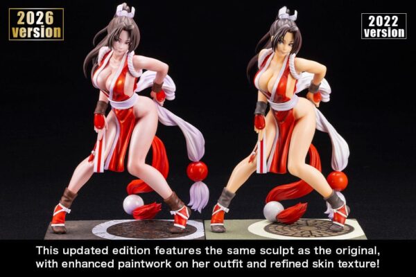 "Mai Shiranui of Team Women Fighters from THE KING OF FIGHTERS '98, a game often praised as the greatest masterpiece of THE KING OF FIGHTERS series, rejoins the figure lineup with a deluxe coat of paint! With the same sculpt design as the previously released SNK THE KING OF FIGHTERS '98 MAI SHIRANUI BISHOUJO STATUE, this new release has improved the painting of her clothes and enhanced the texture of her skin! Starting with a healthy upper body wrapped in her red and white kunoichi costume, her obi's bow contrasts perfectly with her hips, and her body lines were beautifully recreated down to her thighs and the back of her knees. This statue can be thoroughly enjoyed from any angle and will stand out no matter where it is placed! The base recreates the road under the overpass of the JAPAN STREET stage which is based off Esaka in Osaka, Japan, where the SNK headquarters used to be. Dive in and immerse yourself in the world of The King of Fighters, available on nearly all platforms, including consoles, mobile, and PC, with this figure!"
