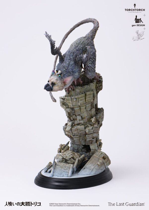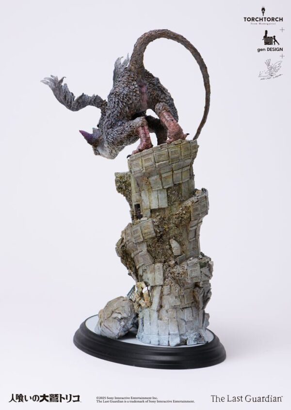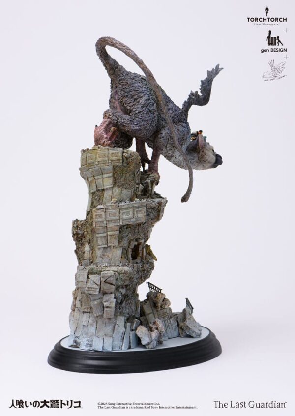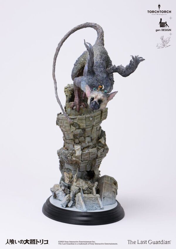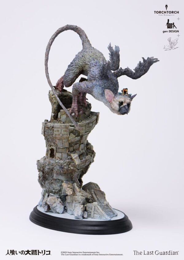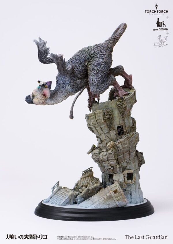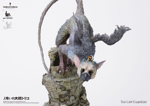 "From the world of The Last Guardian comes a finely crafted statue that embodies the artistry and emotion of the game. Created under the close supervision of genDESIGN, the studio led by Fumito Ueda, this large-scale piece has been sculpted and hand-painted by acclaimed artist Akishi Ueda. Trico, carrying the boy on his back and gazing toward the next foothold, is captured in a single dynamic moment as the tower collapses around them. The piece faithfully captures Trico's complex character, combining mystique, raw power, and gentle charm. The boy's figure, clutching Trico's feathers with his clothes billowing in the air, conveys the very pressure of the wind he feels. The depiction of the tower collapsing under the impact of the landing is incredibly immersive. With clay and rubble fragments used in the modeling, you can almost hear the rumbling crash. A white gradient fading downward creates an atmospheric perspective that evokes the sense of open space beneath the base. The carefully designed color scheme, with light and shadow arranged as if the sun were overhead, showcases the signature style of Akishi Ueda. Produced by TORCH TORCH, this is the first officially licensed The Last Guardian statue worldwide. Each detail reflects our passion and commitment to quality. This is more than a character recreation. It is a commemorative art piece to be appreciated for years to come."
