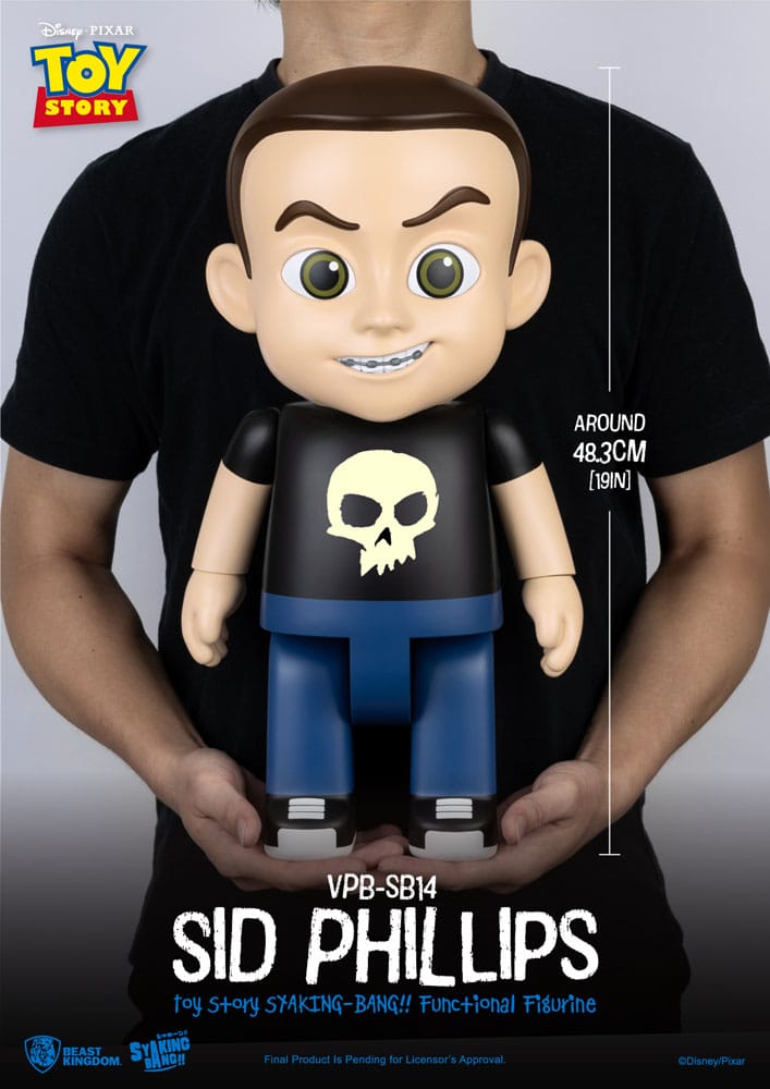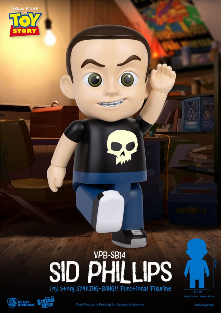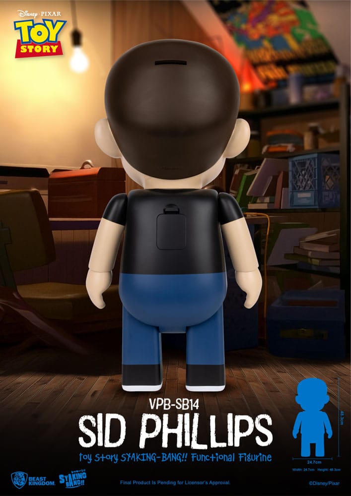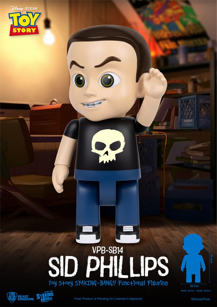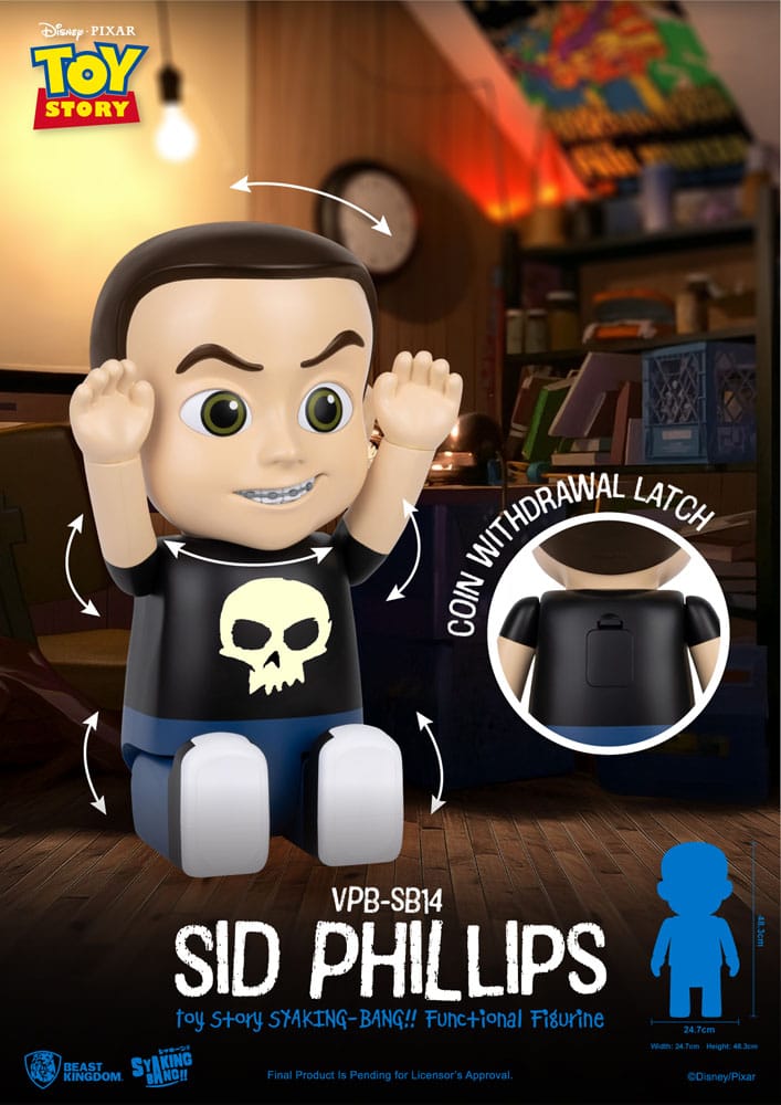 i"Ha-ha-ha! Watch out, toys!" The mischievous Sid is back-and this time, he's not destroying toys, but invading your collection shelf! Beast Kingdom proudly presents the classic Toy Story character Sid Phillips as part of the SYAKING-BANG!! Series, standing at an impressive 48.3 cm tall. Every detail of Sid's iconic look-from his wicked grin and metal braces to his signature black skull T-shirt-is faithfully recreated with meticulous craftsmanship. The figure features articulated joints at the head and limbs, allowing various expressive poses, such as Sid's trademark laugh or menacing stride. The functional coin slot on the back adds practicality to its collectible charm, making it both a display piece and a fun interactive piggy bank. Bring home the unforgettable "bad boy" of Toy Story and add a bold touch of nostalgia to your collection today!