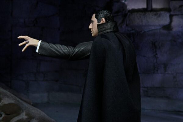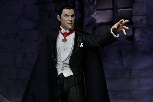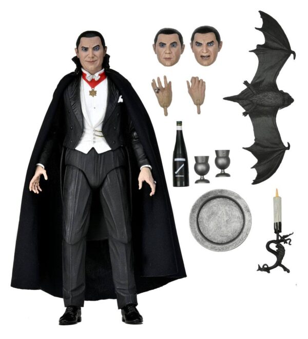 To celebrate the 90th anniversary of Universal Monsters' acclaimed silver-screen classic, NECA announces an Ultimate action figure of the most famous vampire of them all... Dracula! We worked closely with the estate of Bela Lugosi to capture the actor's expressive likeness in three different head sculpts, and for additional background detail on important costume elements. Standing in 7" scale, the Ultimate Dracula (Transylvania) action figure has a soft goods cape and comes in premium anniversary packaging with plenty of accessories: 3 interchangeable heads, interchangeable hands, large bat, wine bottle, goblets, candlestick and serving plate.