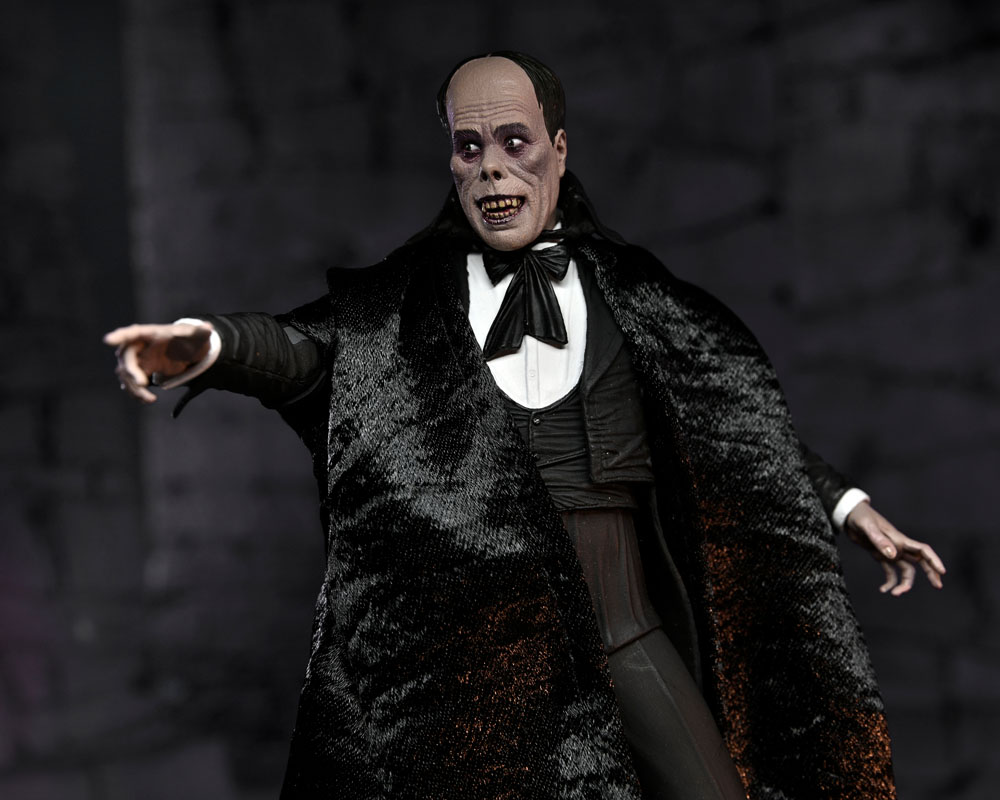 Celebrating more horror legends, NECA is excited to reveal The Phantom of the Opera! Starring Lon Chaney, the 1925 silent movie was famed for the shocking appearance of the Phantom, which Chaney created himself and kept secret until the premiere. Almost a century later, the thriller is still critically acclaimed and was added to the United States National Film Registry in 1988 for its historical and cultural significance. The 7" scale figure captures the Phantom both disguised and unmasked with five interchangeable heads, and also includes fabric cloak, bamboo stick and hat accessories. Display-friendly window box packaging with opening front flap.