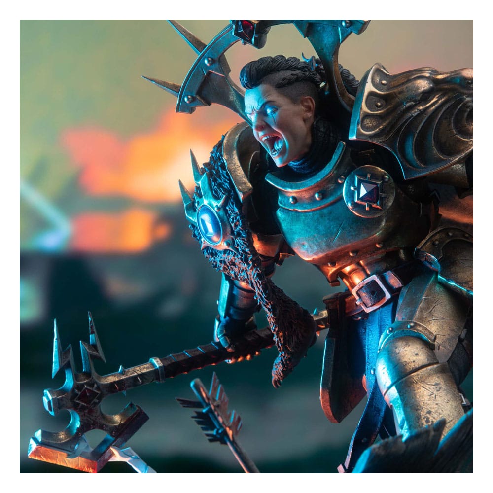 iWhen lightning strikes, it heeds not the wind, nor does it skirt the rain; it descends from the heavens in an instant, searing the very air that dared impede its path. So too does Neave disregard all who stand between her and her target, delivering the wrath of Sigmar in a storm of sinew and steel. Those foolish enough to bar her warpath find their flesh strewn as a visceral reminder of her hunt, evidence that none can escape Blacktalon's strike. Captured in a single, wrathful instant, Neave Blacktalon storms into battle; golden armour ablaze, axes sparking with lightning, her war cry echoing across the battlefield. Every detail tells the story of Sigmar's chosen assassin: the splintered war platform beneath her feet, the Orruk helm crushed into the dirt, the storm-forged fury carved into every line of her form. This dynamic pose was brought to life by our passionate artists, drawing on decades of experience in worldbuilding and character design, distilling Neave's relentless spirit into collectible form. From the delicate arc of her braided hair in motion, to the painstaking textures of battered steel and bloodied blades, each element has been sculpted, refined, and painted with the same obsessive attention to detail that has come to define our craft. A hero of the Mortal Realms rendered in full 1:6 scale, Neave Blacktalon, The God-King's Assassin is a divine example of crafting myth into matter, and fury into form. - Limited Edition of 650; - 1:6 scale; - Made primarily from polystone; - Digitally sculpted by Weta Workshop artisans, Daniel Cockersell and Victor Gully; - Dynamic pose captures Neave mid-sprint, vaulting from a shattered Orruk war platform; - Armed with her axes, crackling with storm-forged lightning; - Armour gleams with the battle-worn lustre of Sigmar's chosen assassin; - Scene completed with crushed Orruk helm and arrows embedded in the earth. Dimensions: 34 cm x 40 cm x 39 cm