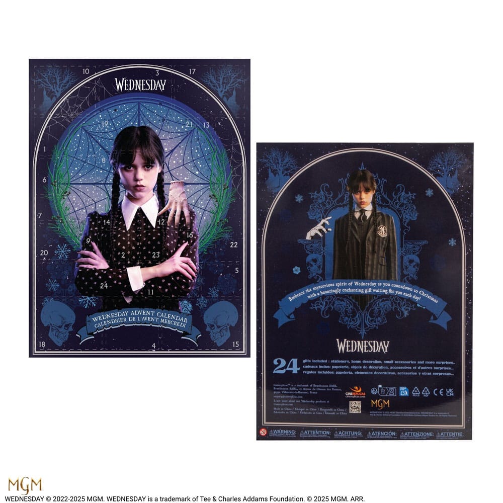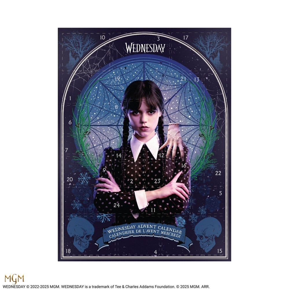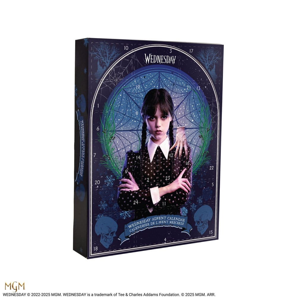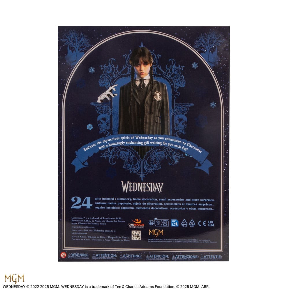 Officially licensed advent calendar with 24 Wednesday themed gift items (Shoes bag, mylar balloon, pen, socks, shaped key ring, acrylic ornament, bracelet, tumbler toy, puzzle, stickers, measurement tape, lenticular bookmark, woven patch, rubber keychain, drawstring pouch, pin, hair clip, mirror, lenticular pin badge, ruler, magnet, luggage tag, ballchain keychain, shopping bag)